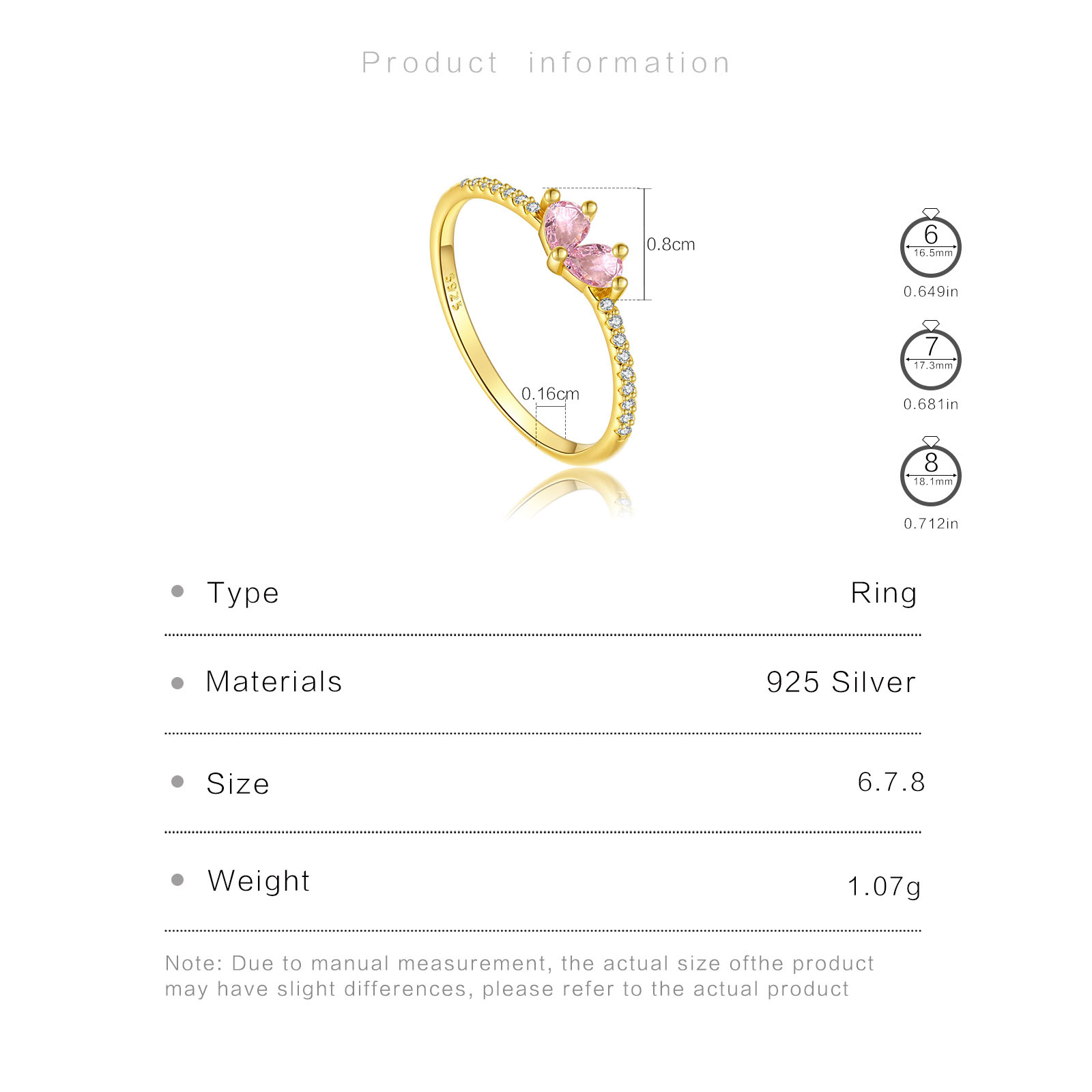 Size  Wire Width 1.6mm CZ 8mm  Ring size 6/7/8