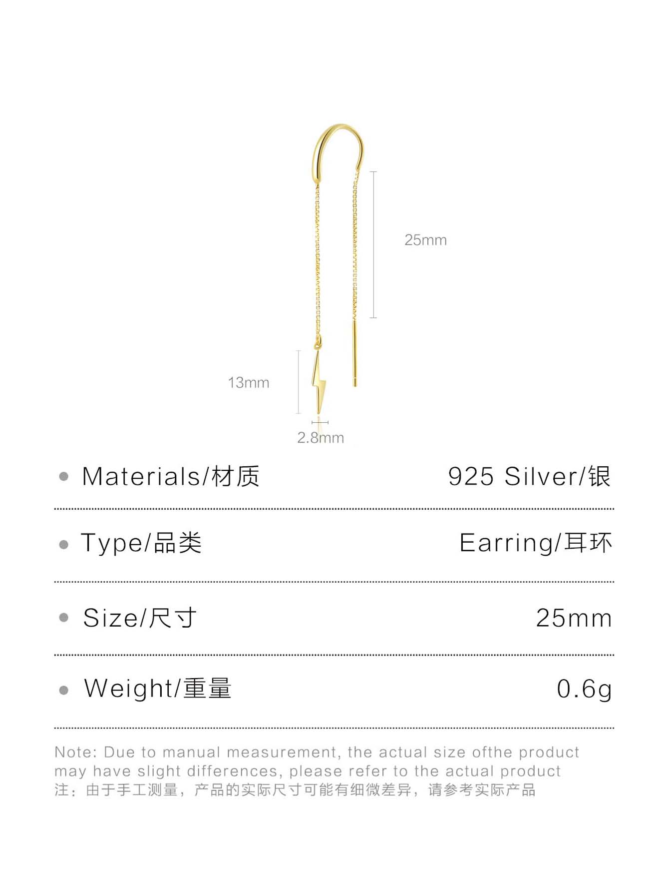 | Size | Total Length 85mm, Chain 25mm, Single Chain 25mm*2 Sides, Lightning Bolt Size 2.5mm x 13mm |