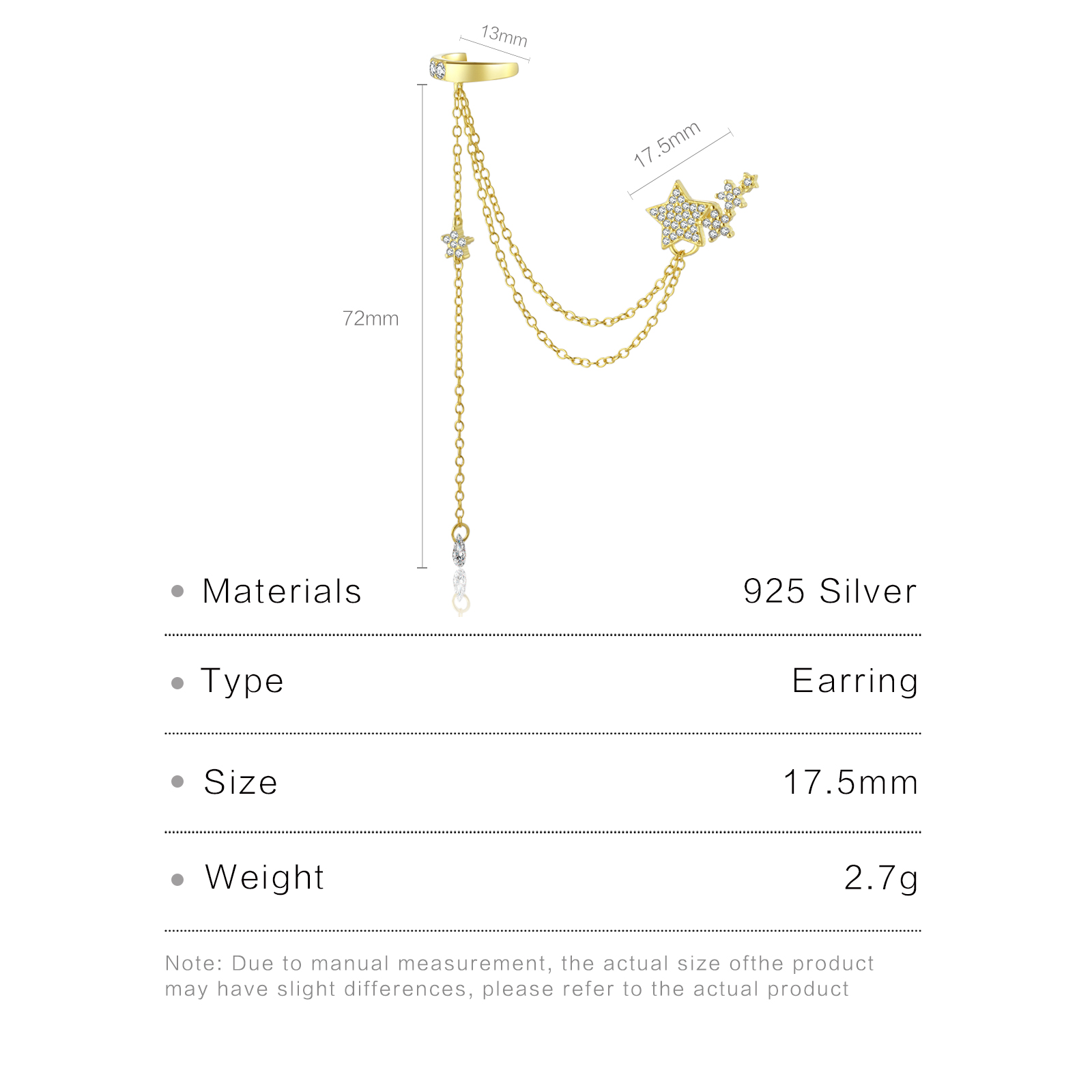| Size | Cuff Width 13mm, Star Size 17.5mm, Total Drop Length 72mm |