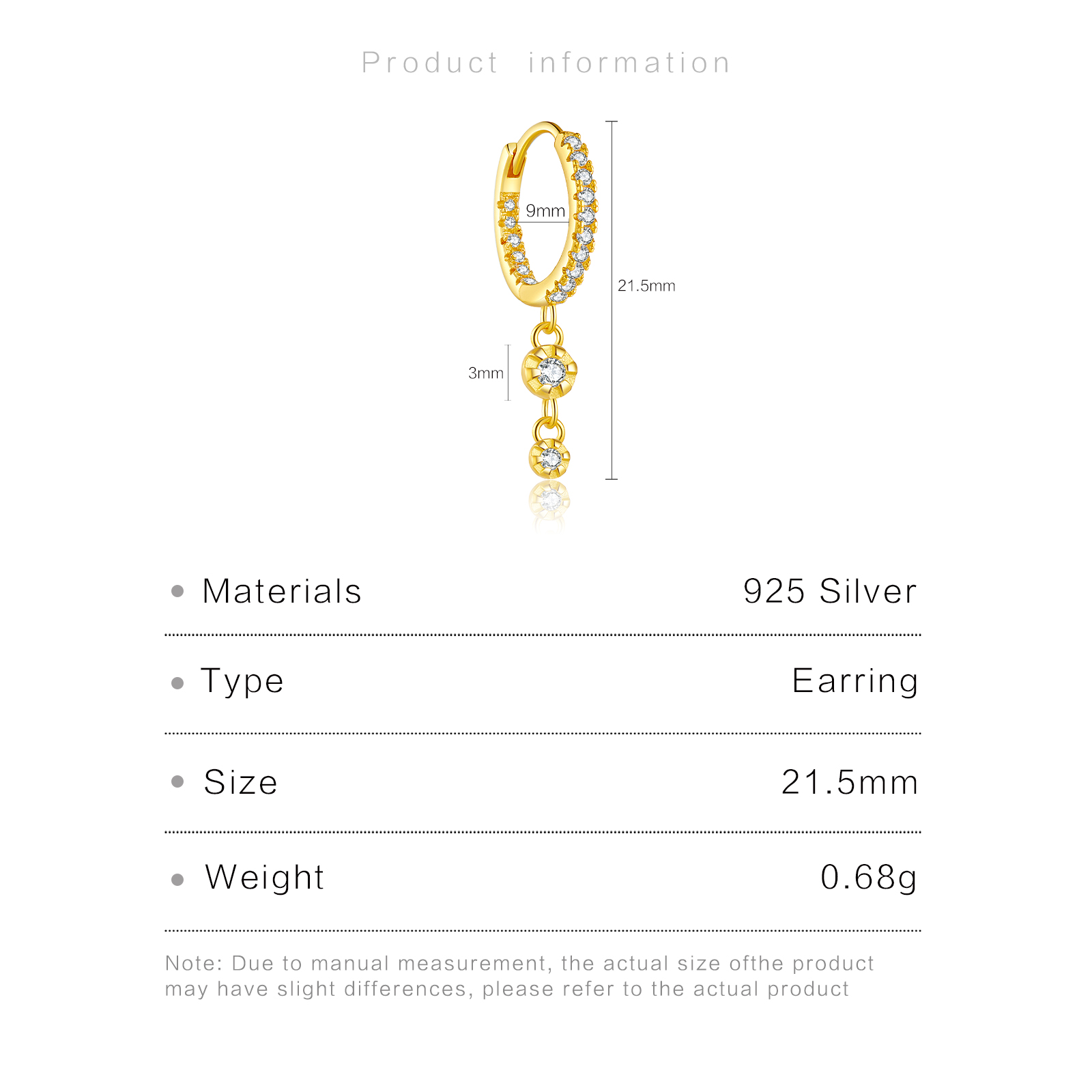 | Size | Inner Diameter 9mm, Total Height 21.5mm, CZ Size 3mm |