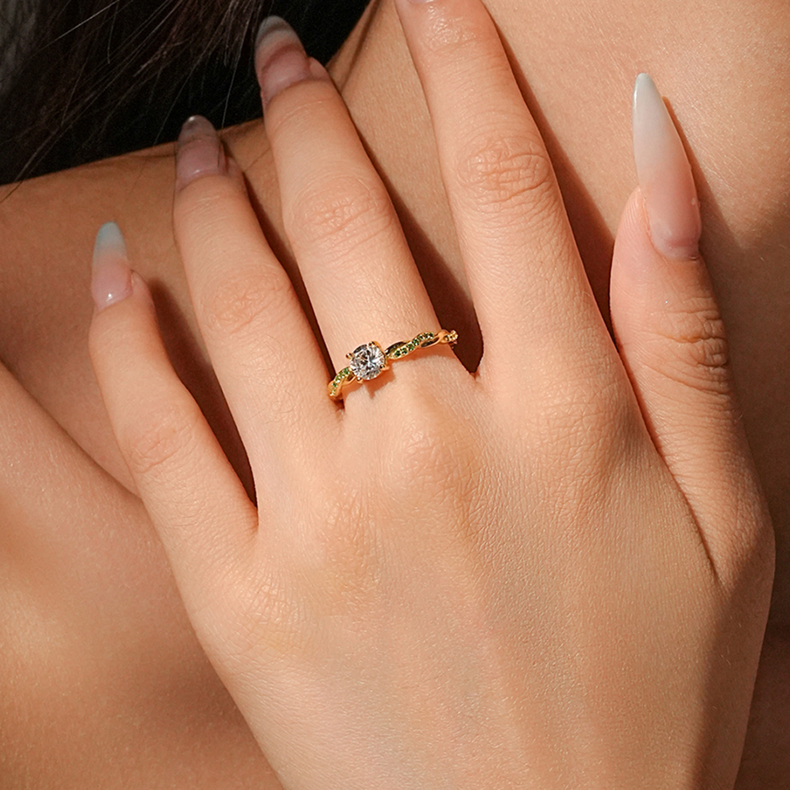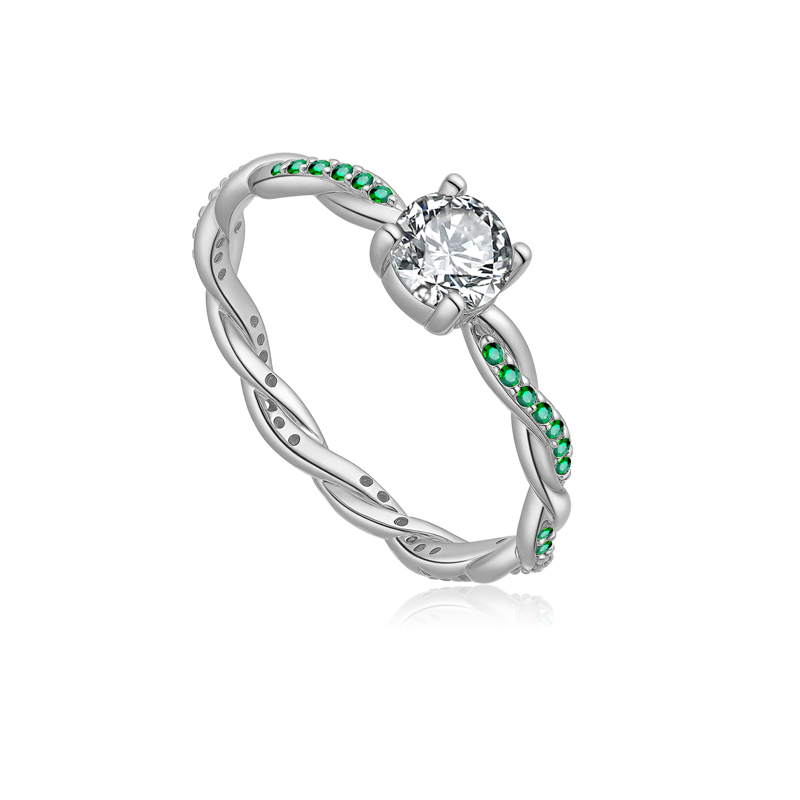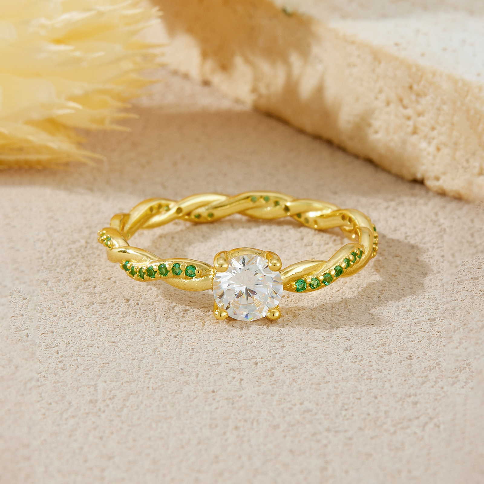 925 Silver Gold-Plated Braided Emerald & Solitaire Diamond Ring-MMR459