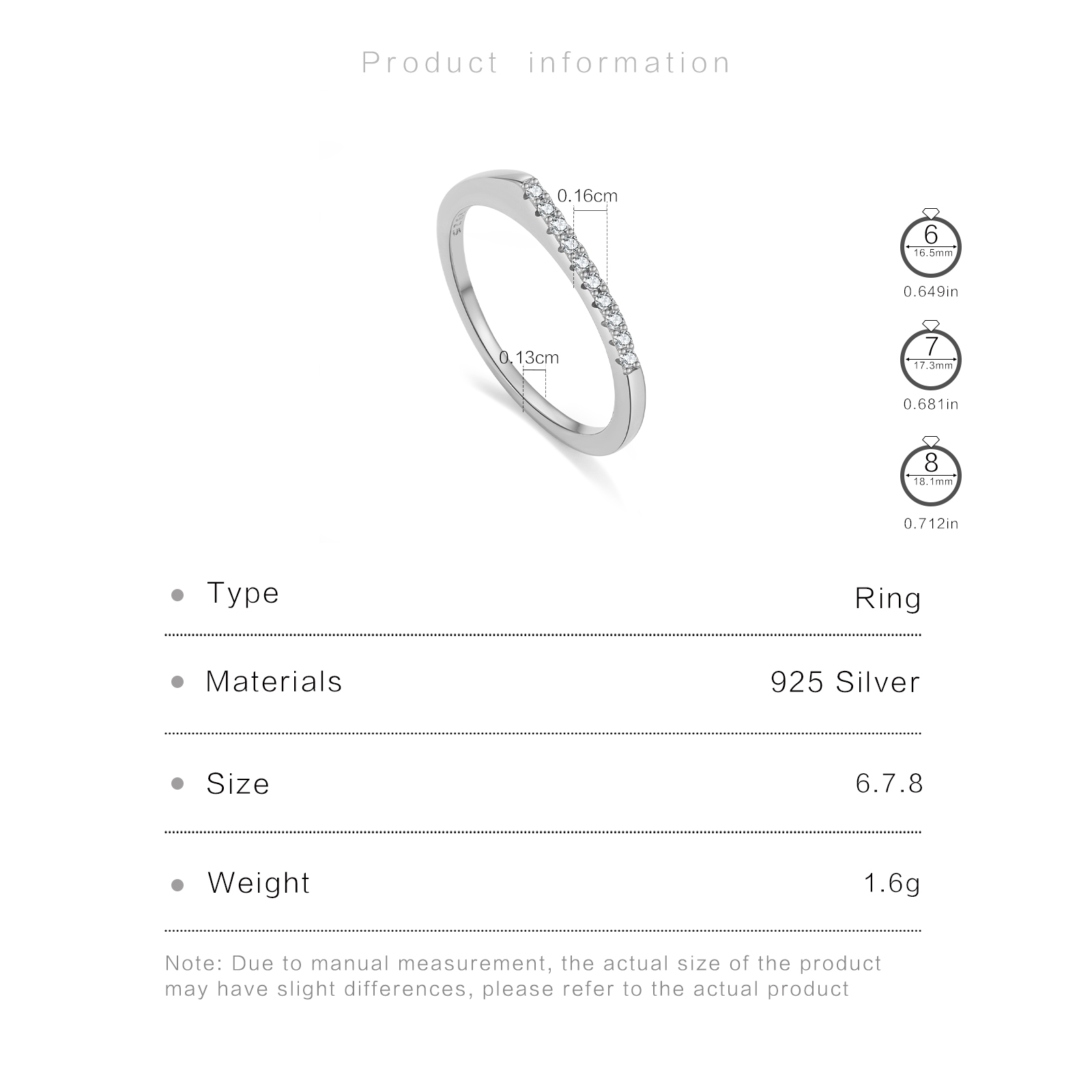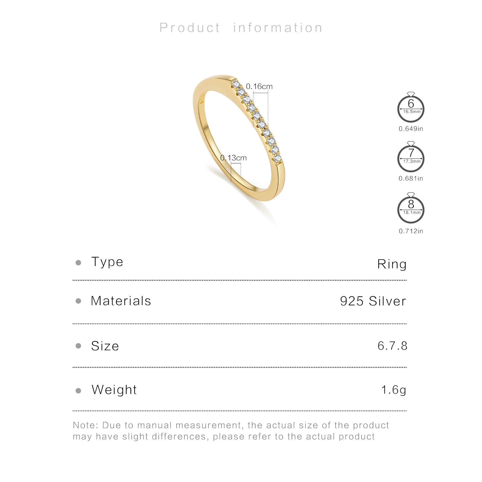 | Size | Wire Width 1.3mm Face Width 1.6mm Ring size 6/7/8 |