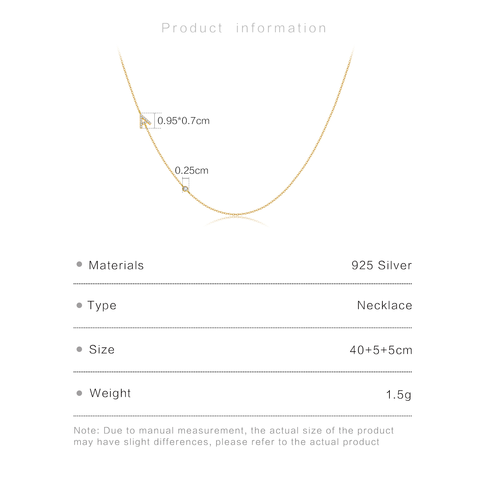 | Size | Chain 40+5+5cm, Letter A 9.5×7mm, Mini CZ 2.5mm |