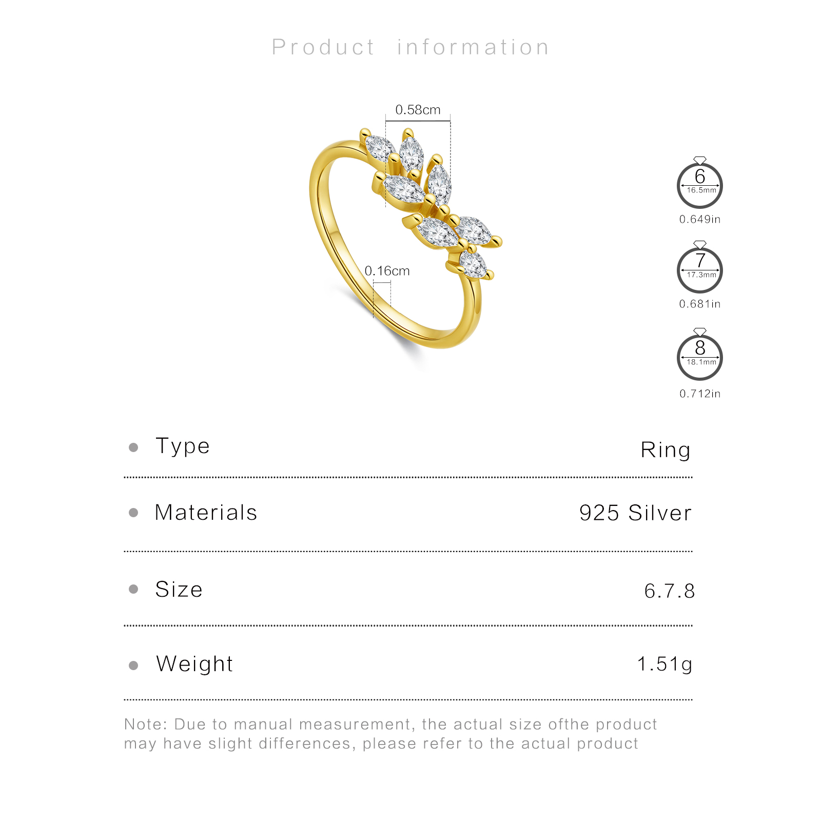 Size  Wire Width 1.6mm  Face Width 5.8mm  Ring size 6/7/8