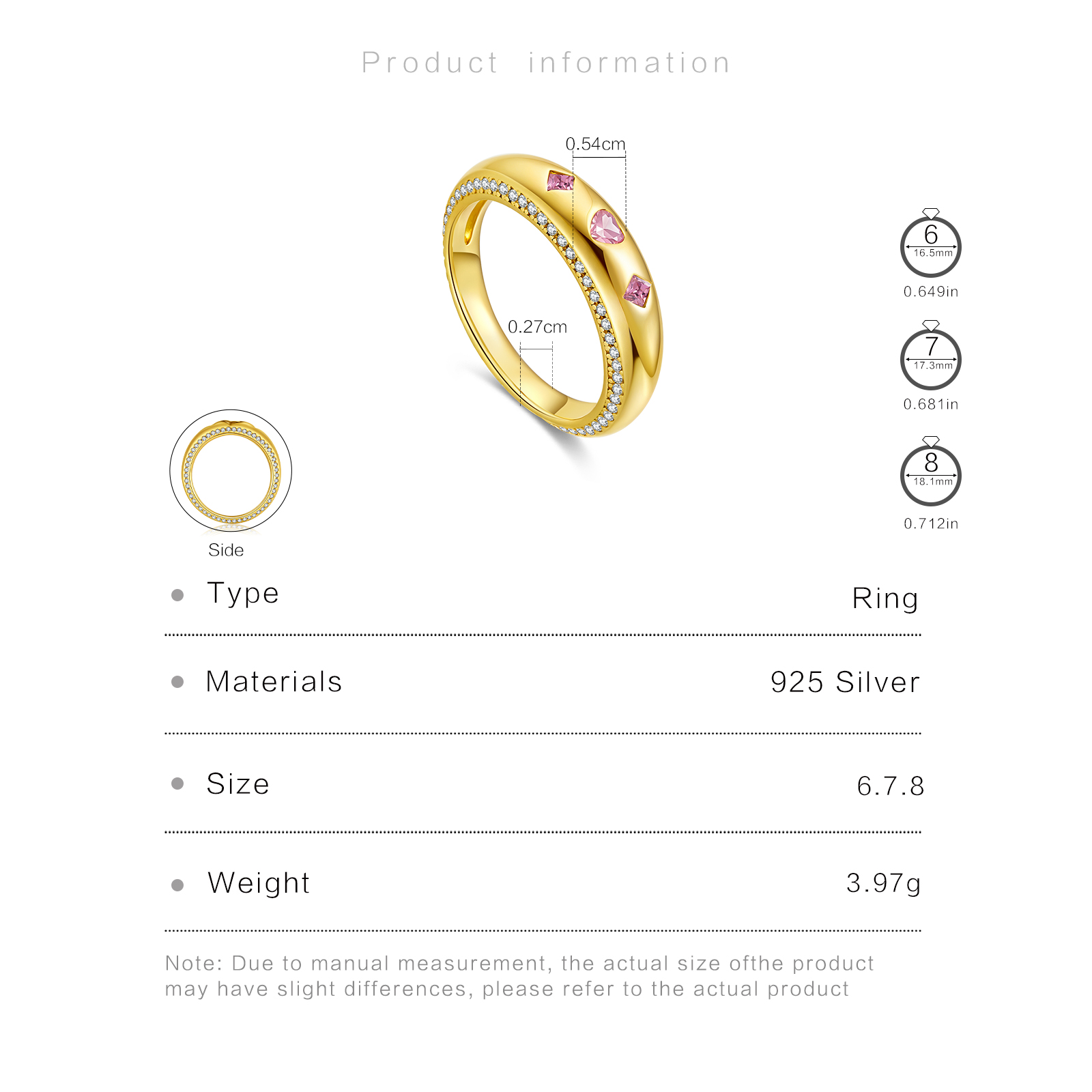 | Size | Wire Width 2.7mm Face Width 5.4mm Ring size 6/7/8 |