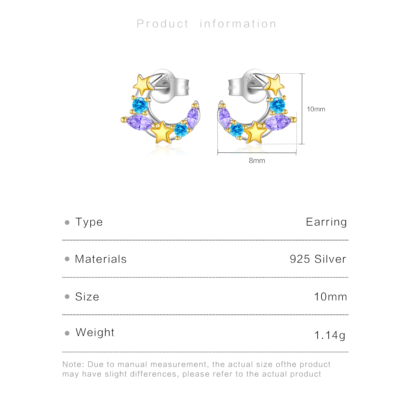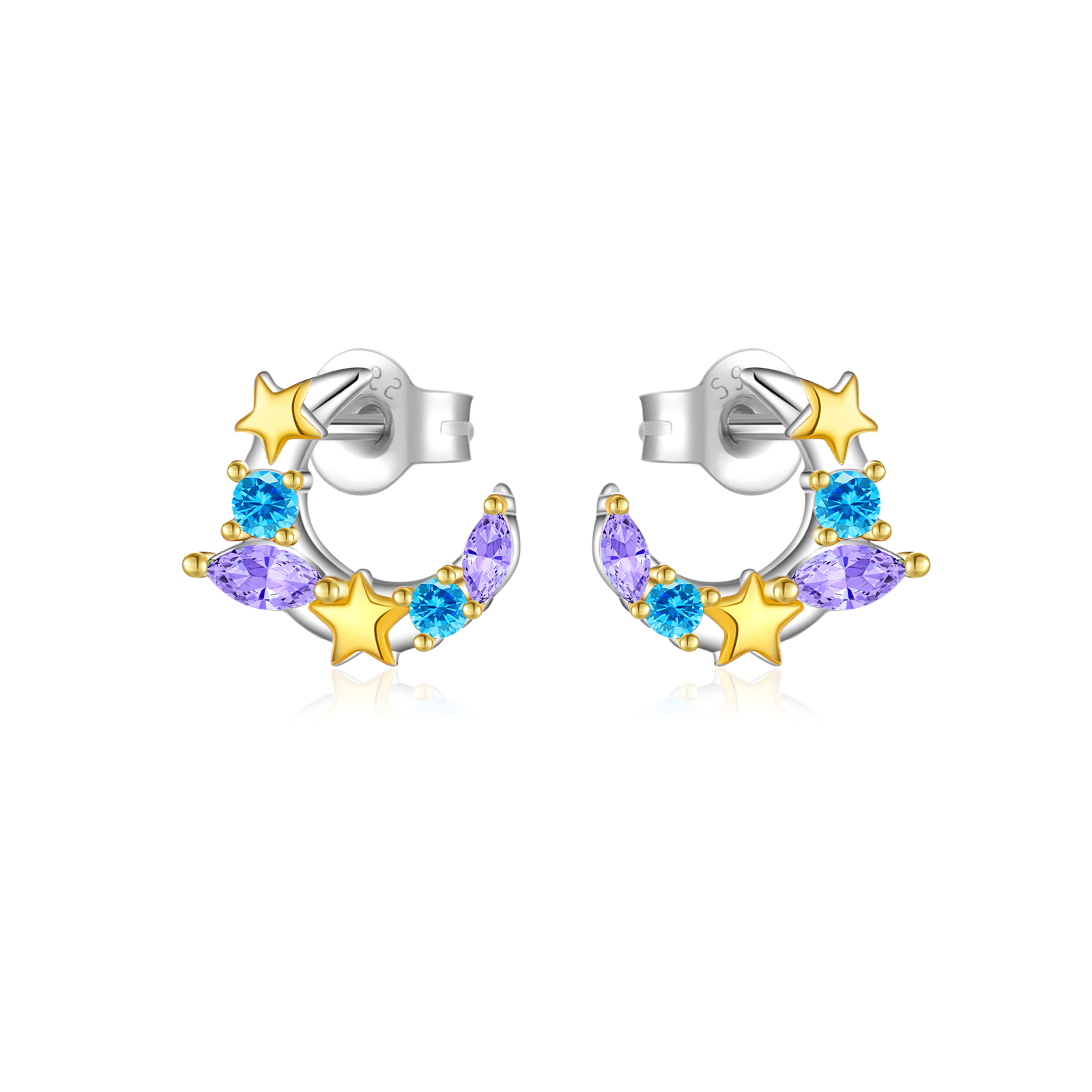925 Silver Gold Plated Star-Moon Shaped Round Color Stone Stud Earrings-MME1069