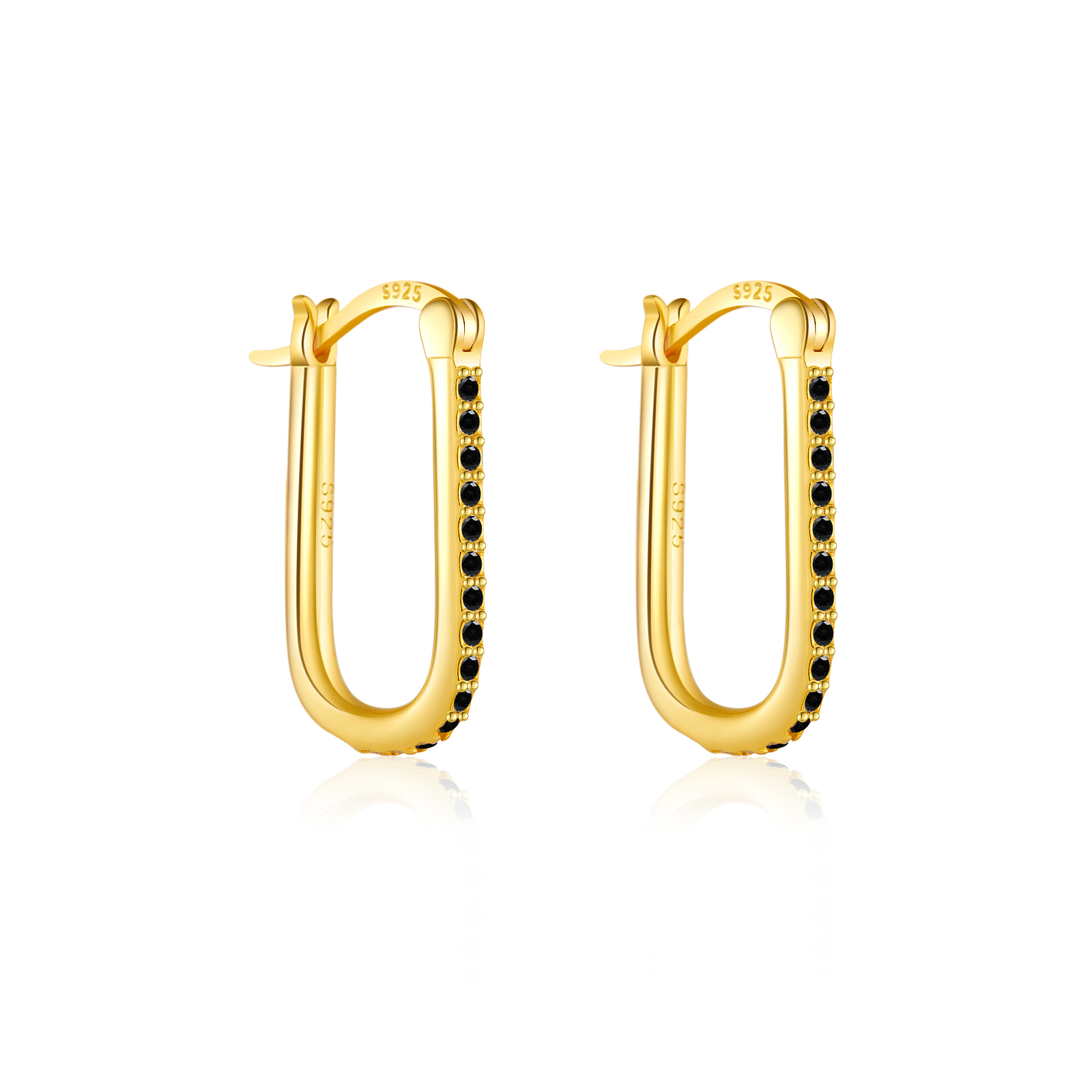 925 Silver Gold Single-Row Black CZ Paved U-Shaped Hoop Earrings-MME186