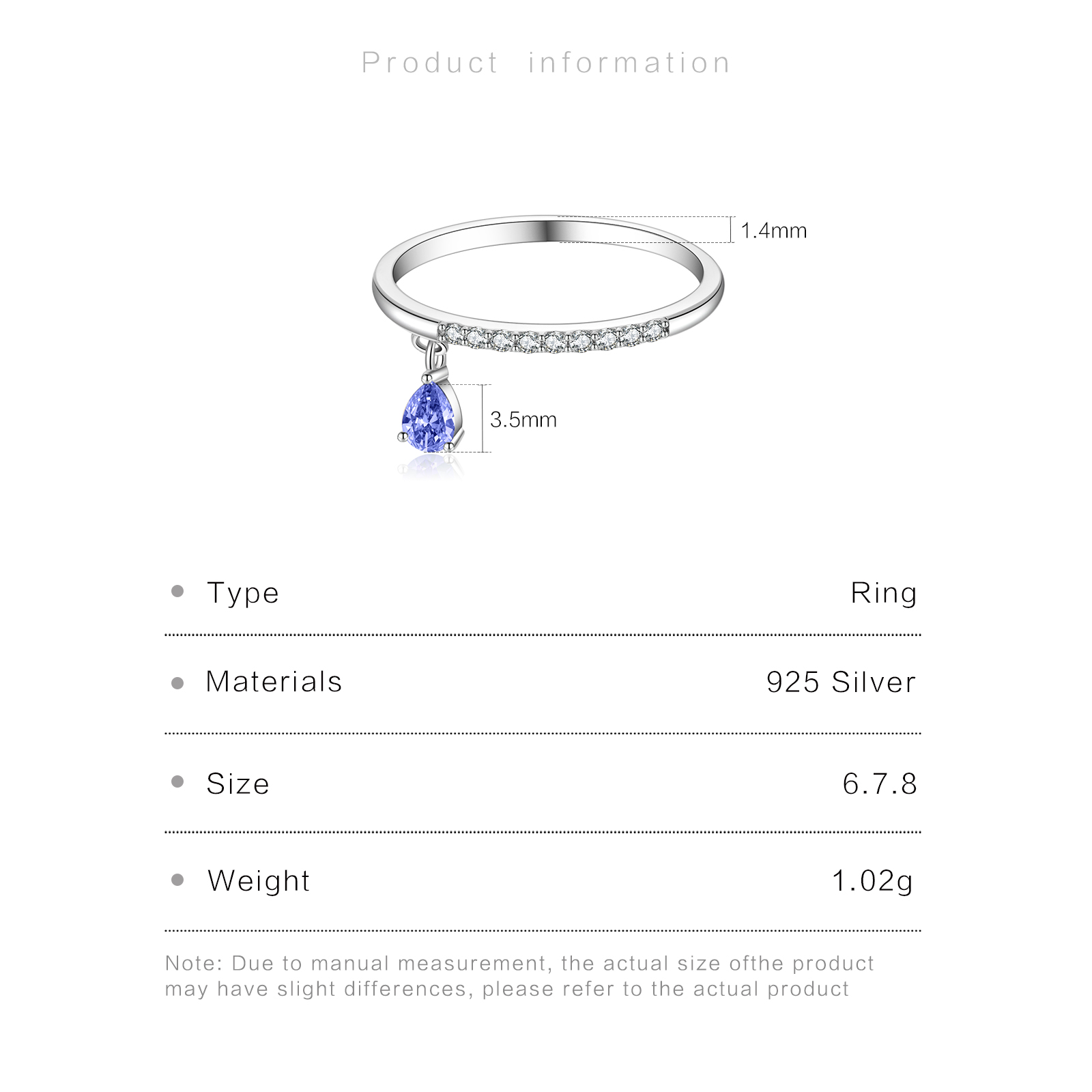 Size  Wire Width 1.4mm  CZ 3.5mm Ring size 6/7/8