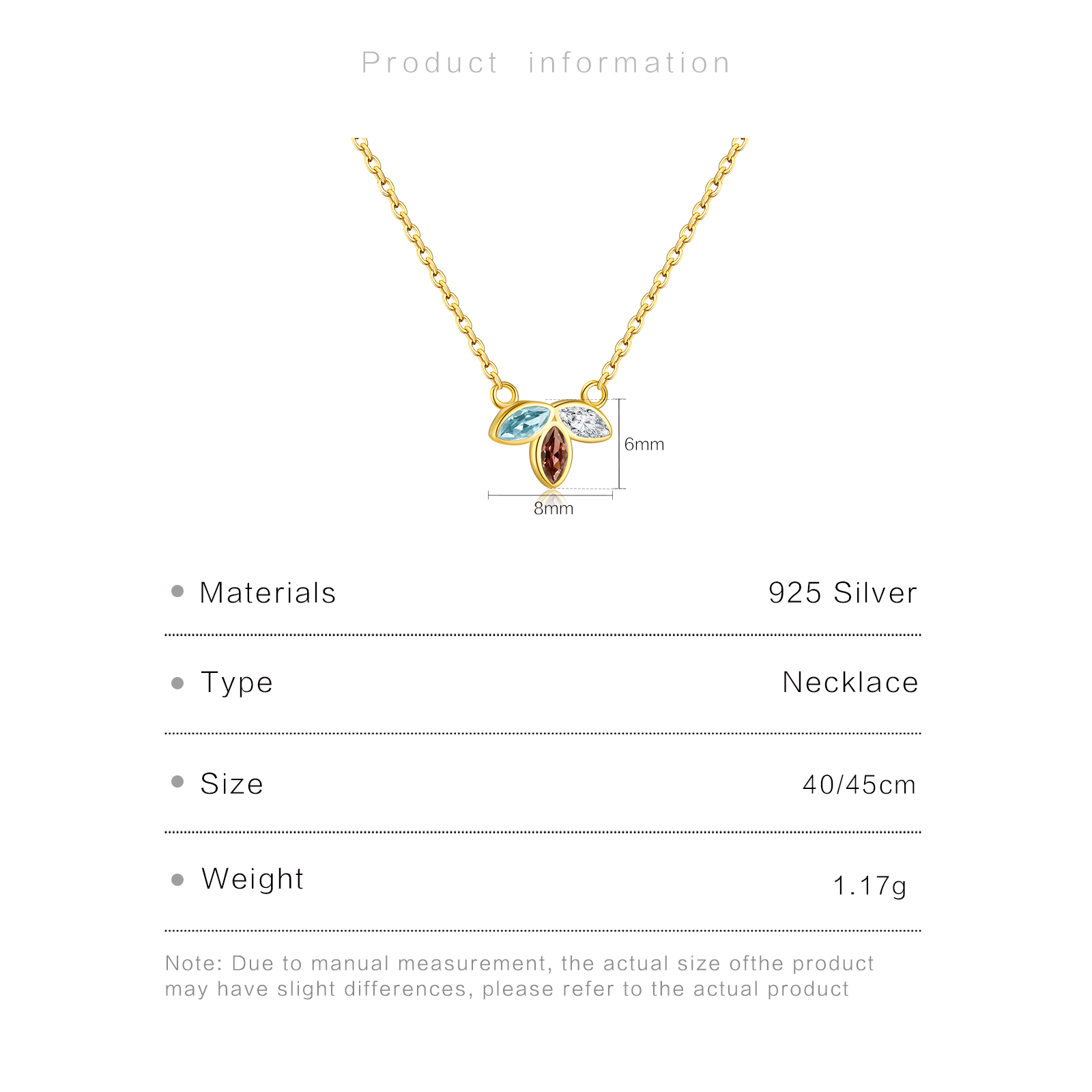 | Size | Pendant:6*8mm Chain Length:40cm/45cm |