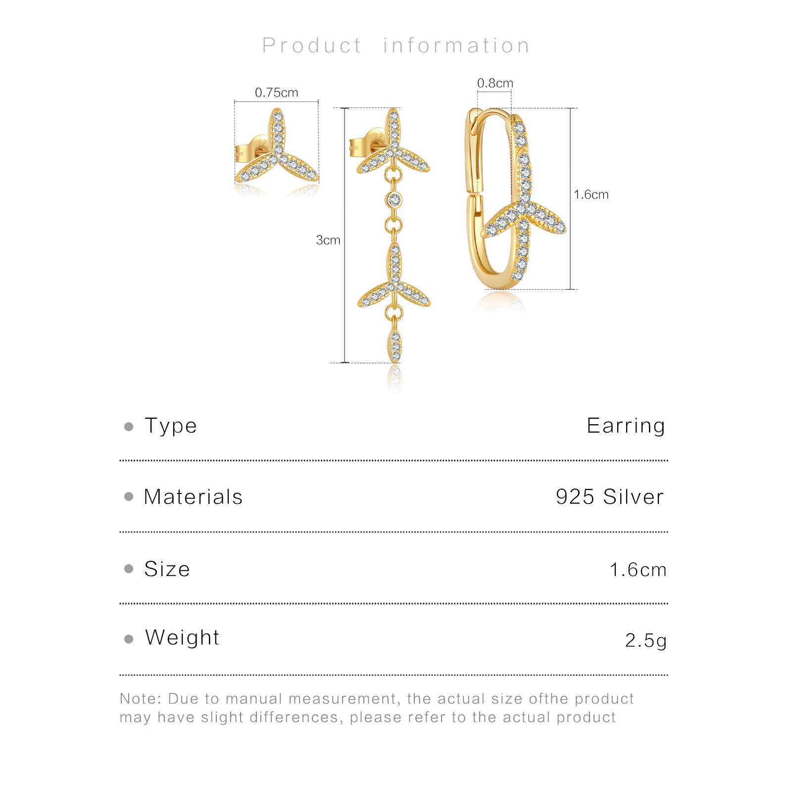 This earring set is made of 925 silver and features a three – petal flower design in a golden hue, inlaid with sparkling zircons. It includes stud earrings, drop earrings, and hoop earrings, offering versatile styling options. Suitable for various occasions, it adds a touch of elegance and charm to your look.