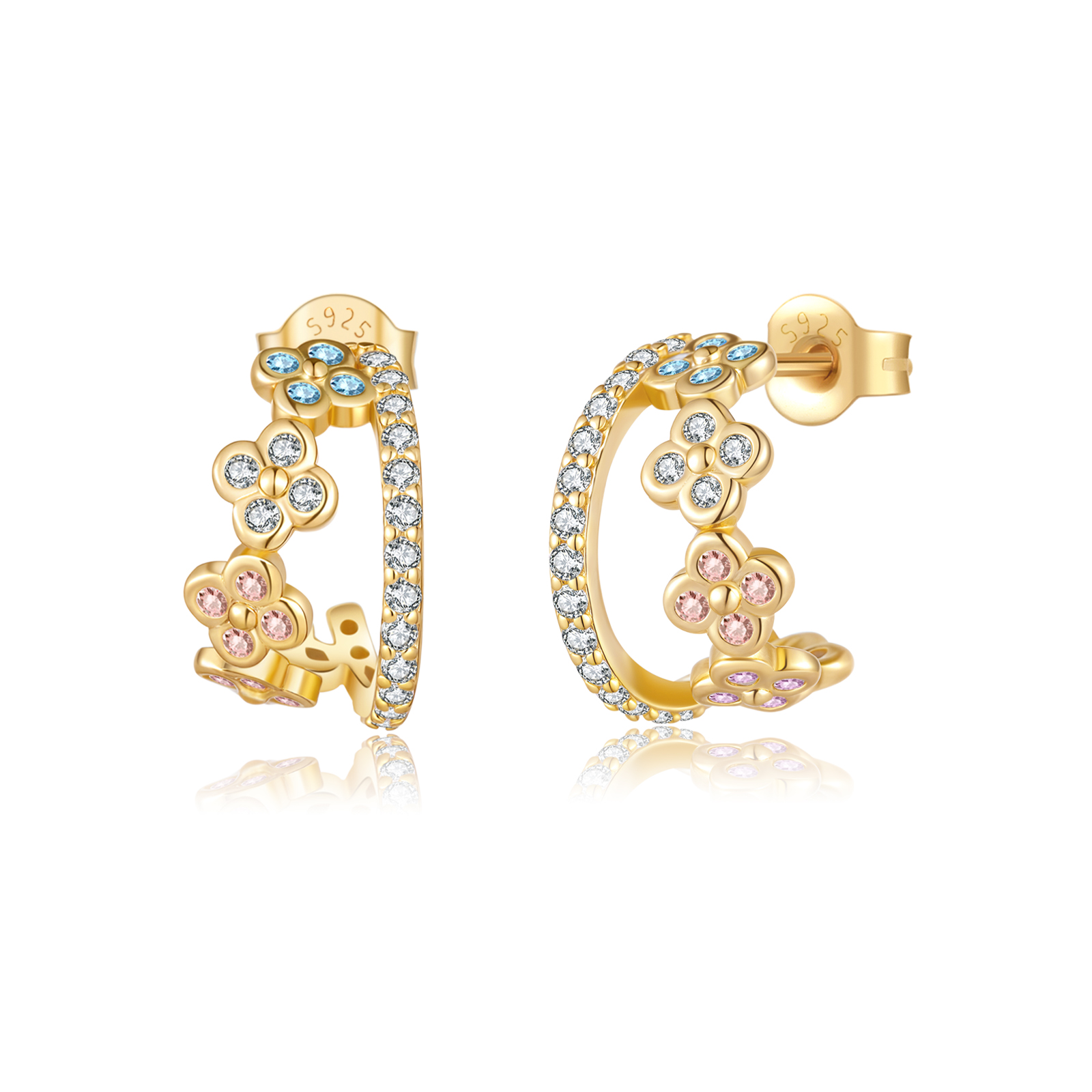 These 925 sterling silver hoop earrings are plated with gold, featuring a charming floral design embellished with colorful zircon stones. They combine elegance and a touch of playfulness, making them an ideal accessory to elevate your style for any occasion.