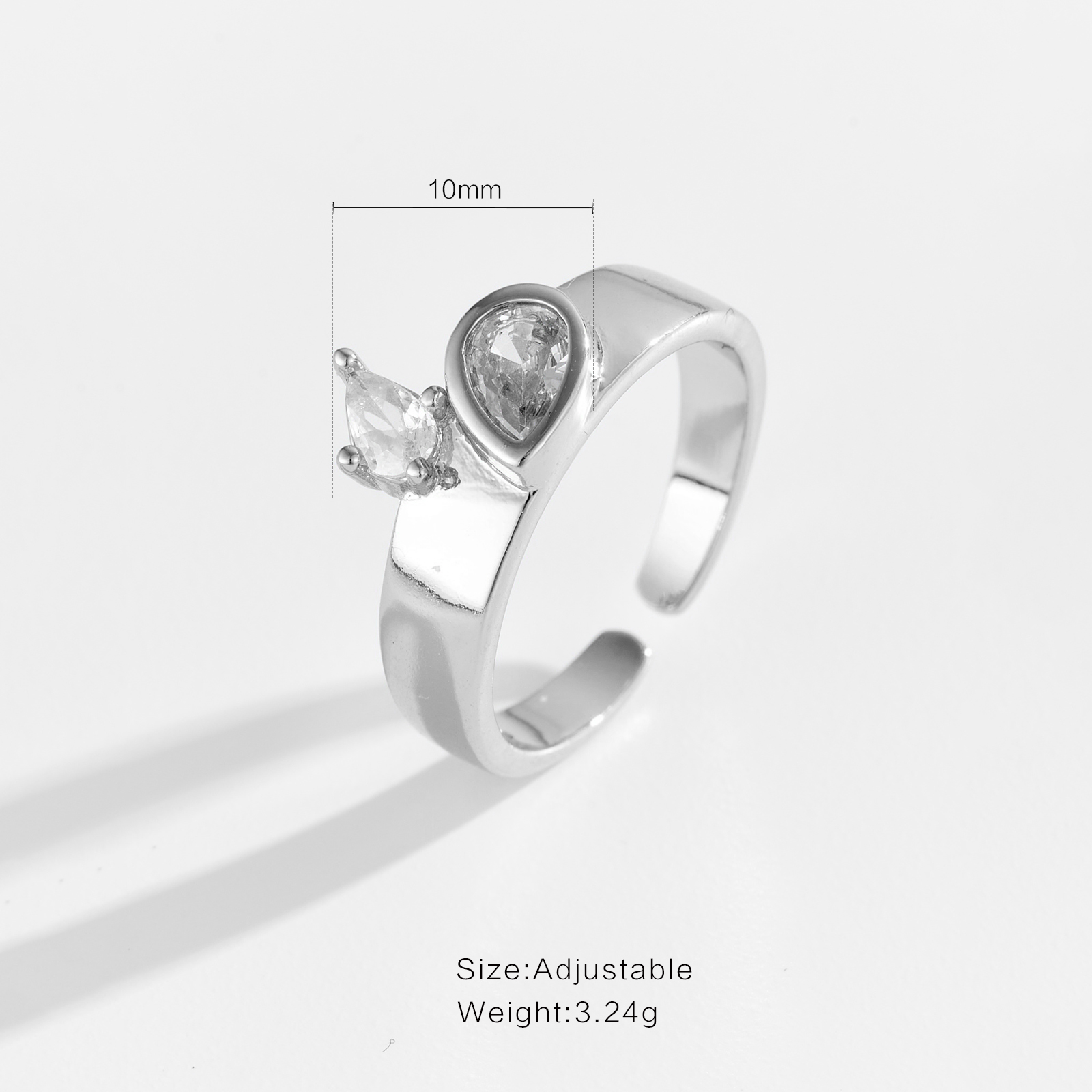 White Copper Gold Plated Adjustable Ring, 10mm Width, Bezel-Set Round Clear CZ, Prong-Set Marquise Clear CZ Accent, Smooth Chunky Band-TTR174