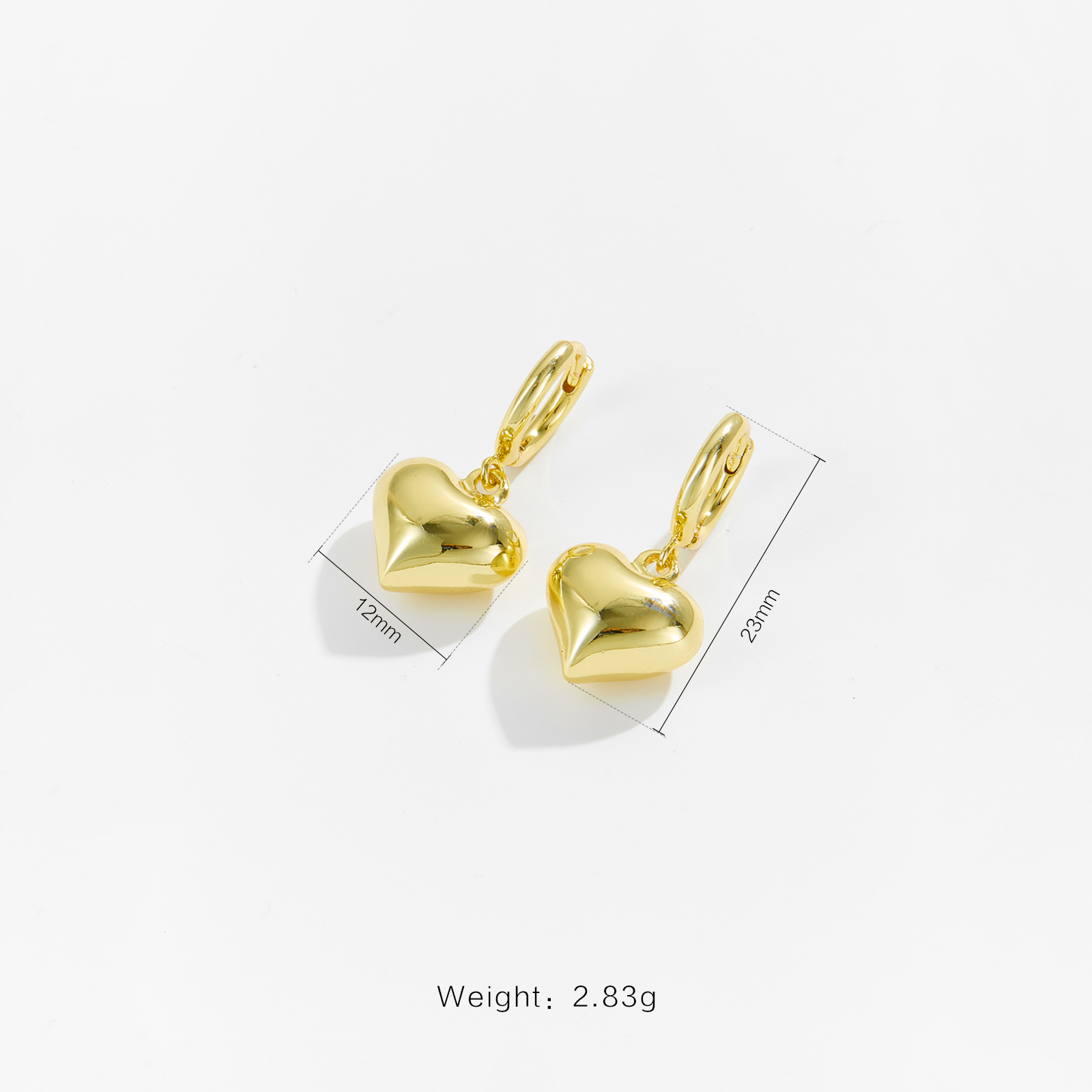White Copper Gold Plated Hoop Earrings, Height 23mm, Width 12mm, with Smooth 3D Heart Charm-TTE059